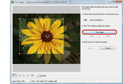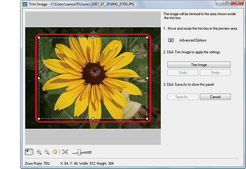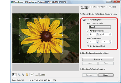 If you click [Advanced Options], you can specify the trim area using specific values and set the aspect ratio.