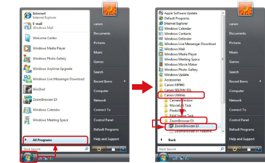 )à [All Programs] or [Programs] à [Canon Utilities] à [ZoomBrowser EX] and select [ZoomBrowser EX] to start ZoomBrowser EX.