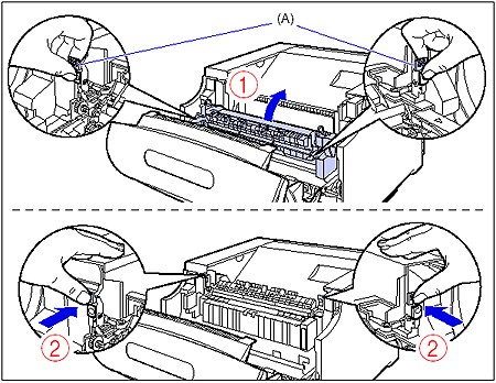 15. While holding the tabs (A), move the fixing unit back to its original position (1), and then press the tabs on the both sides as shown in the figure (2).