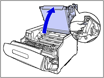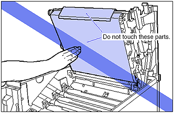 - Do not touch the transfer belt of the ITB unit and the ITB unit cover. If the transfer belt is damaged, this may result in misfeeds or deterioration in print quality. If the print quality deteriorates due to the transfer belt of the ITB unit being touched, see [Cleaning the Transfer Belt of the ITB Unit] and clean the transfer belt of the ITB unit. The transfer belt of the ITB unit is supplied with a function that cleans itself, therefore, you do not need to clean the belt even when toner is on it.
