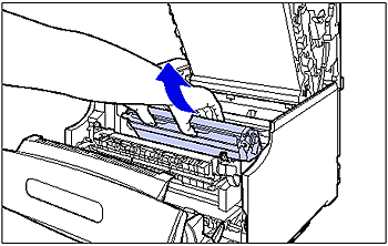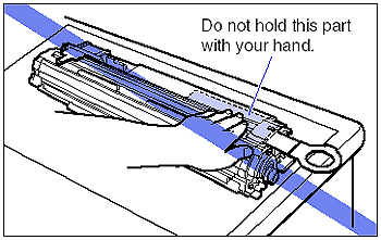 - If it is difficult to pull the sealing tape out by the tab, hold the tape and pull it out as shown in the figure. However, your hands may become dirty as toner is on the sealing tape.