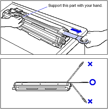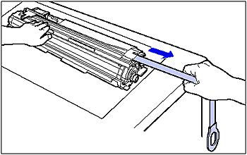 6. Pull the sealing tape (approx. 70 cm long) out gently and horizontally while supporting the drum cartridge.