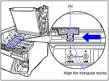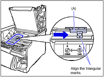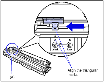 7. Before installing the drum cartridge, align the triangular mark on the lock release lever (A) with the triangular mark of "