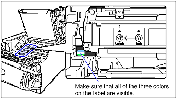 If you cannot see any of the three colors on the label from the front, take out the drum cartridge once, turn the projection (A) in the direction of the arrow until it clicks and stops, and then reinstall the cartridge.