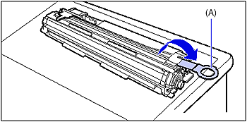 5. Place paper on a flat surface, place the drum cartridge on it, and then fold back the tab (A) of the sealing tape as shown in the figure.