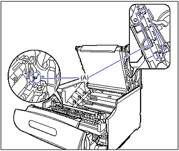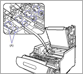 - Be sure not to touch the high-voltage contacts (A) shown in the following figures, as this may result in damage to the printer.
