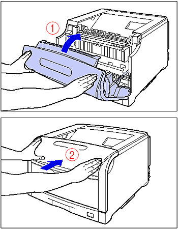 While supporting the front cover (1), push and close the front cover with both hands as shown in the figure (2).