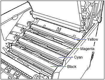 - The drum cartridges are installed from the bottom in order of Yellow, Magenta, Cyan, and Black.