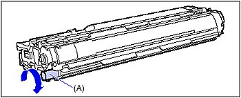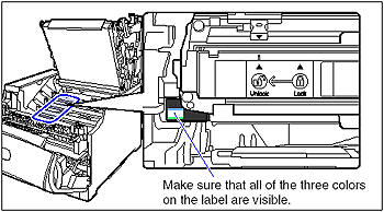 If you cannot see any of the three colors on the label from the front, take out the drum cartridge once, turn the projection (A) in the direction of the arrow until it clicks and stops, and then reinstall the cartridge.