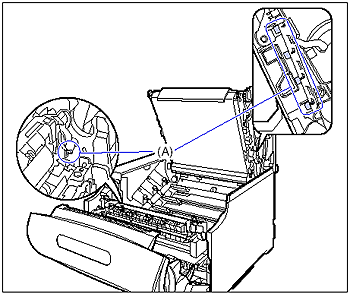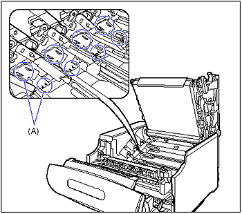 - Be sure not to touch the high-voltage contacts (A) shown in the figure. This may result in damage to the printer.