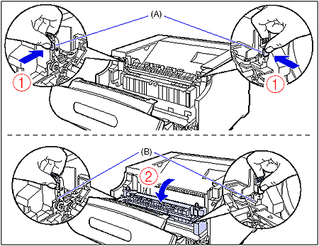While pressing the green lock release buttons (A) on the left and right side of the fixing unit (1), hold the tabs (B) and tilt the fixing unit toward you (2) as shown in the figure.