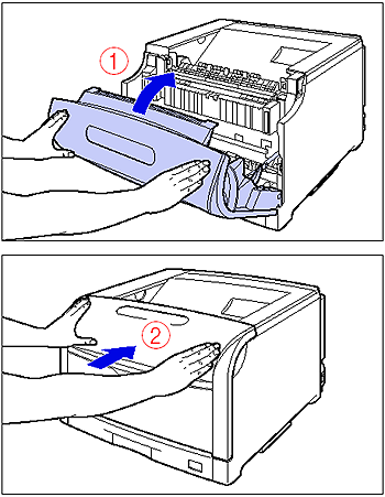 While supporting the front cover (1), push and close the front cover with both hands as shown in the figure (2).