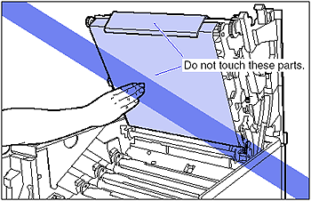 - Do not touch the transfer belt of the ITB unit and the ITB unit cover. If the transfer belt is damaged, this may result in misfeeds or deterioration in print quality. If the print quality deteriorates due to the transfer belt of the ITB unit being touched, see [Cleaning the Transfer Belt of the ITB Unit] and clean the transfer belt of the ITB unit. The transfer belt of the ITB unit is supplied with a function that cleans itself, therefore, you do not need to clean the belt even when toner is on it.