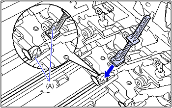 13. Make sure that the levers (A) near the drum cartridge guides on the both sides are in the proper position as shown in the figure.