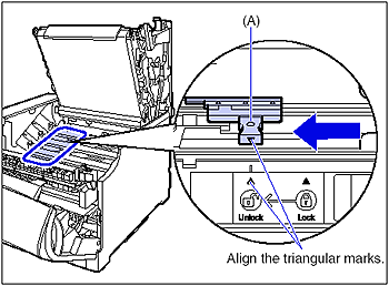 12. Before installing the drum cartridge, align the triangular mark on the lock release lever (A) with the triangular mark of "