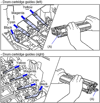 Insert the projections (A) on each side of the drum cartridge into the drum cartridge guides as shown in the figure.