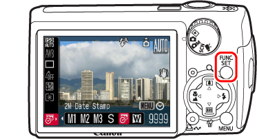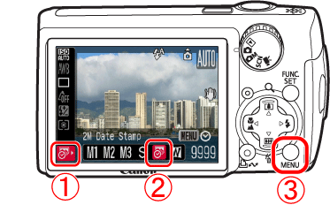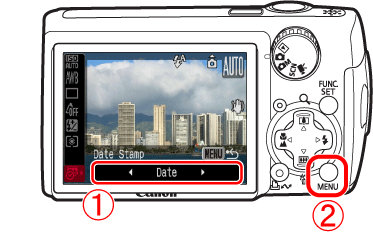 Press the camera button as shown above (right and left), select [Date Stamp] and set it to [Date] or [Date & Time].