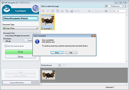 When scanning is completed, the Scan Complete dialog box opens. Select Scan or Exit. Select Scan to scan the next document, or select Exit to end.