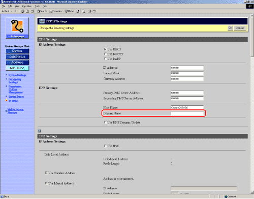You can also check the DNS Settings on <DNS Settings> in <IPv4 Settings> in <TCP/IP Settings> in <Network Settings> of <System Management Settings> (from the Additional Functions screen) on the machine.