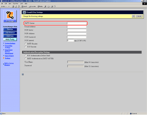 E-mails and I-faxes are sent via the SMTP mail server. If the SMTP mail server is not set properly, e-mails or Ifaxes cannot be sent. Check the SMTP server name.