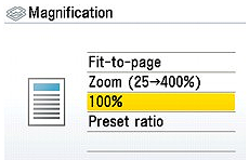 - When you select Fit-to-page, the document size may not be detected correctly depending on the original. In this case, select Preset ratio, Zoom (25 - 400%), or 100%.