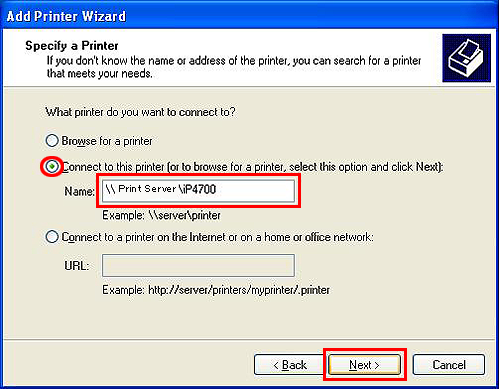 3-5. Check "Connect to this Printer (or to browse for a printer, select this option and click Next)," enter the full computer name and the share name you confirmed in the step 2-2 and 1-3 in "name" respectively.