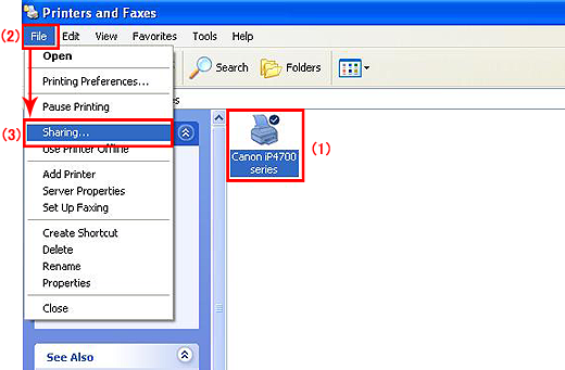1-2. Select the "Canon iP4700 Series" icon, then click "File" and " Sharing"