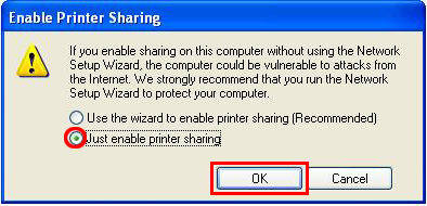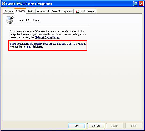 1-3. Click "If you understand the security risks but want to share printers without running the wizard, click here".