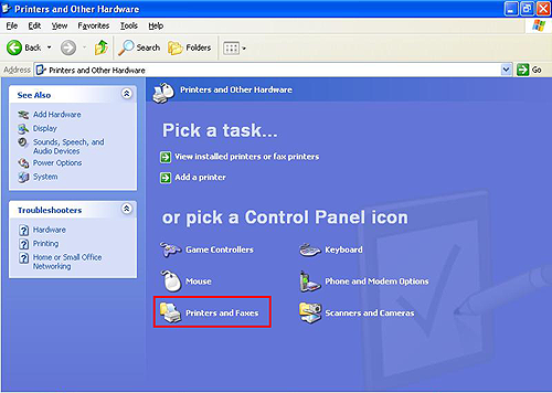 1-1. From the Start menu, select "Control Panel", "Printers and Other Hardware", then "Printers and Faxes".