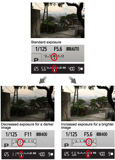 If the mode dial of this camera is set to a mode other than <M>, the camera automatically sets the appropriate exposure value. If you want to adjust the exposure value that is set by the camera, you can use the exposure compensation setting.