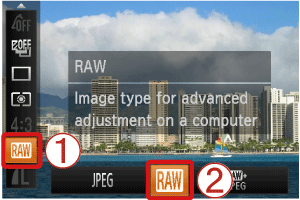 ).[JPEG]![]() | Records a JPEG image. When JPEG images are recorded, the images are processed inside the camera for optimum image quality and compressed. However, the compression process is irreversible, meaning that the raw data cannot be recovered once it has been compressed. Moreover, the image processing results in a deterioration in quality. |