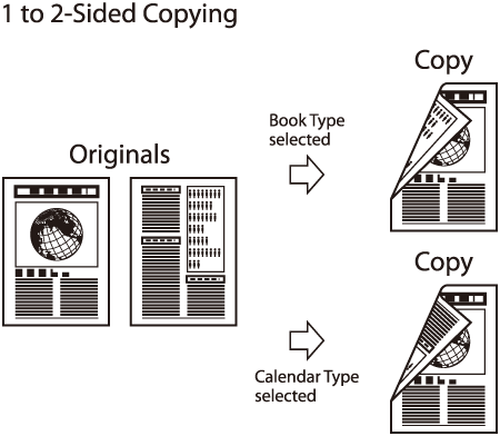 This mode enables you to make two-sided copies from one-sided or two-sided originals, or make one-sided copies from two-sided originals. This enables you to cut print costs in half when copying in large quantities.