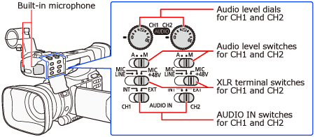 Set the audio level switch of the desired channel to A (automatic) to let the camcorder automatically adjust that channel’s audio level. If CH1 and CH2 are set to the built-in microphone and you set CH1 to automatic audio level adjustment, then the camcorder will also automatically adjust the audio level for CH2.