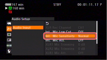2. Select [Audio Setup] -> [Audio Input] -> [Int. Mic Sensitivity] in that order.