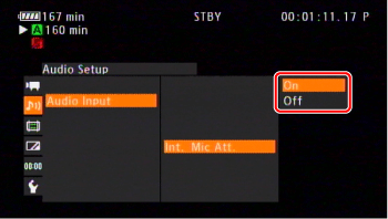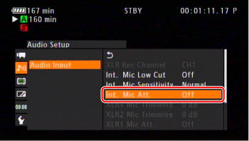 2. Select [Audio Setup] -> [Audio Input] -> [Int. Mic Att.] in that order.