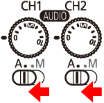 You can set the audio level to auto or manual for each channel. When both CH1 and CH2 are set to the built-in microphone, the settings for CH1 will automatically be applied to CH2.