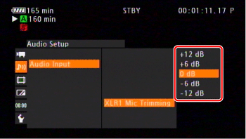 2. Select [Audio Setup] -> [Audio Input] -> [XLR1 Mic Trimming] or [XLR2 Mic Trimming] in that order.