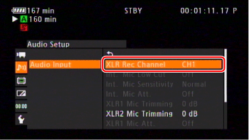 2. Select [Audio Setup] -> [Audio Input] -> [XLR Rec Channel] in that order.