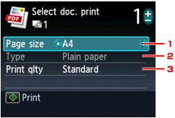 - The screen displayed when you select Select doc. print and the one displayed when you insert the memory card/USB flash drive are the same. For details on how to select Select doc. print from the card menu, see [ Printing Photos Saved on the Memory Card / USB Flash Drive ].