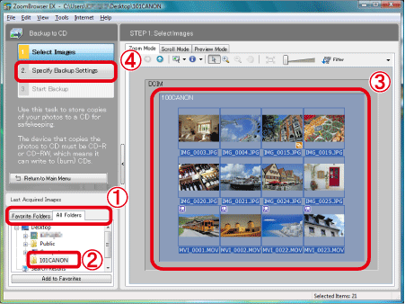 the folder that contains the images to save the CD-R/RW disc. Images exported to [ZoomBrowser EX] are usually saved in [Pictures] or [My Pictures] folder.