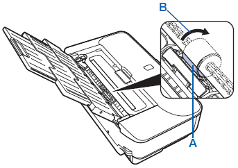 If the problem is not resolved after cleaning the Paper Feed Roller in the Rear Tray, turn off the power, disconnect the power plug, then wipe the Paper Feed Roller (A) located in the center inside the Rear Tray with a moistened cotton swab or the like. Rotate the roller manually in the direction of the arrow (B) as you clean it. Do not touch the roller with your fingers; rotate it with the cotton swab.