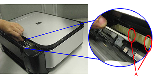 6. Place a moistened cotton swab, etc. to one of the protrusions (A) of the feed roller shaft.