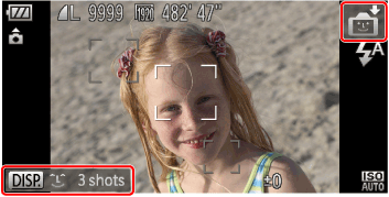 ( ) | Point the camera at a person and press the shutter button fully. The camera will shoot approximately two seconds after it detects a wink. | - Wink a bit slowly. - A wink may not be detected if eyes are covered by hair or a hat, or when wearing glasses. - Shutting both eyes will also be detected as a wink. - If a wink is not detected, the camera will automatically shoot after about 15 seconds later. - If there are no people in the shot when the shutter button is pressed fully, the camera will shoot after a person enters the shot and winks. |