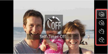 ( ) | The shutter will release approximately two seconds after the camera detects a new face. You can use this when the photographer wants to be in the image, such as a group photo. | - To cancel shooting with the self-timer after the countdown has started, press the down button of the < directional buttons >. - If the camera cannot detect the face of a new subject that has entered the shot, it will shoot after about 15 seconds later. |