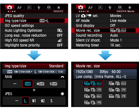 ] tab, press the <SET> button, and then select the recording size from the screen that appears.