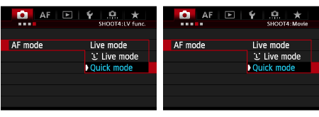 The image sensor is used to focus. Although AF is possible with the Live View image displayed, the AF operation will take longer than with Quick mode. Also, achieving focus may be more difficult than with Quick mode.