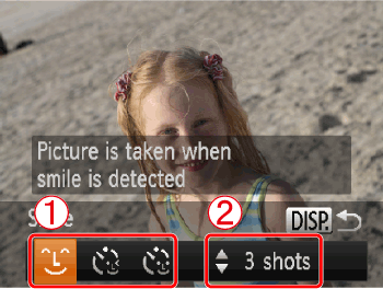 ( ) | Point the camera at a person and press the shutter button fully. The camera will shoot approximately two seconds after it detects a wink. | - Wink a bit slowly. - A wink may not be detected if eyes are covered by hair or a hat, or when wearing glasses. - Shutting both eyes will also be detected as a wink. - If a wink is not detected, the camera will automatically shoot after about 15 seconds later. - If there are no people in the shot when the shutter button is pressed fully, the camera will shoot after a person enters the shot and winks. |