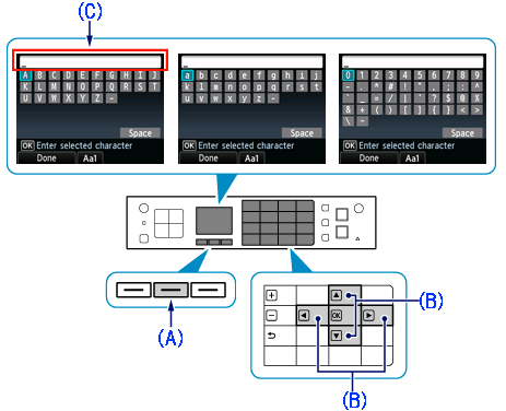 * To insert characters, select the section (C) of the screen using the