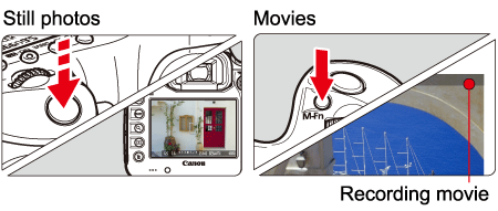 Please note that some shooting procedures differ between still photos and movies. To shoot still photos, please refer to the instructions for still photos, and to shoot movies, please refer to the instructions for movies.
