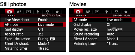 This page describes how to change the focus mode for Live View shooting. For details on how to perform easy Live View shooting in default settings, please refer to the related information.
